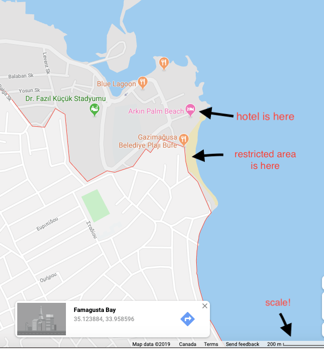 Meanwhile, on the other side of the fence, modern life continues apace. 21st century resorts and hotels dot the coastline directly north of Varosha, offering great vacation deals. Here’s a google map showing just how close one hotel is to the no-go zone.